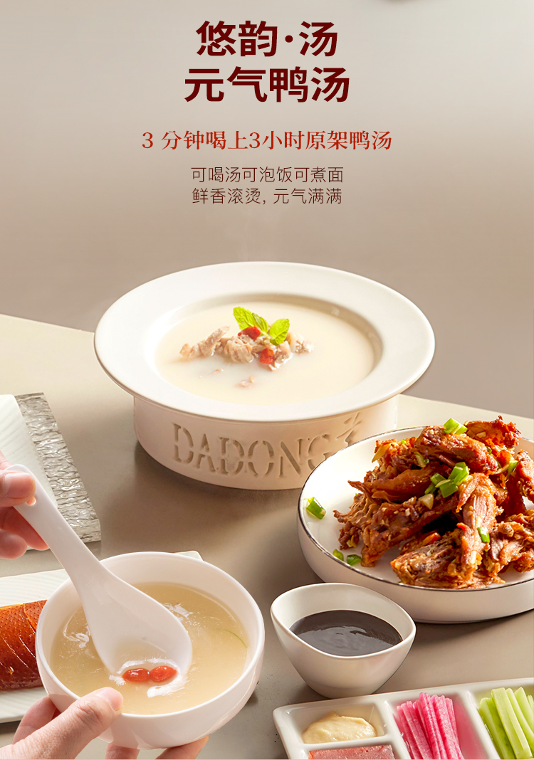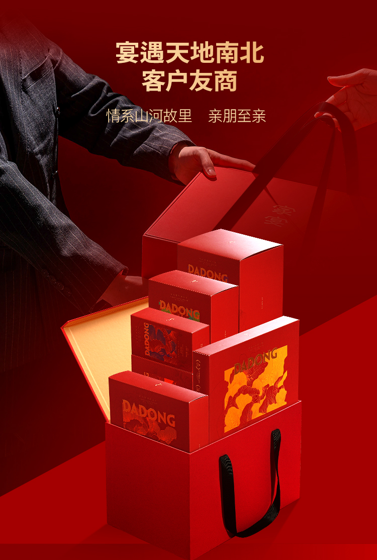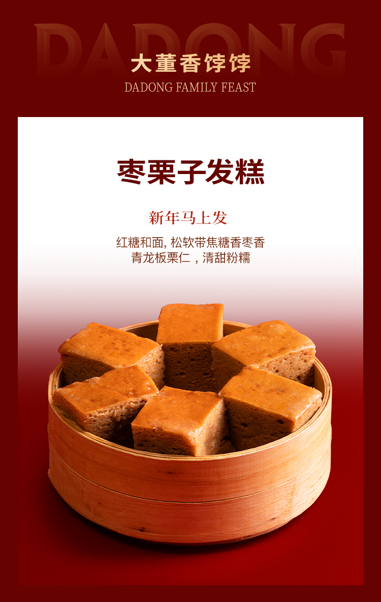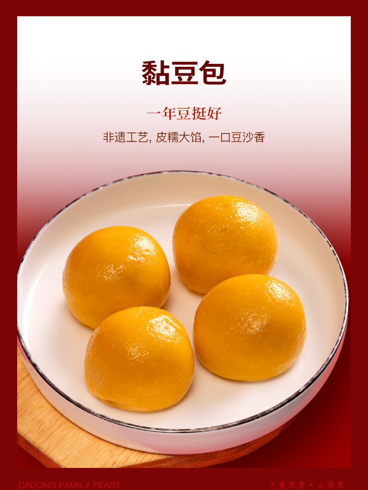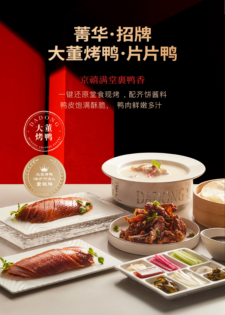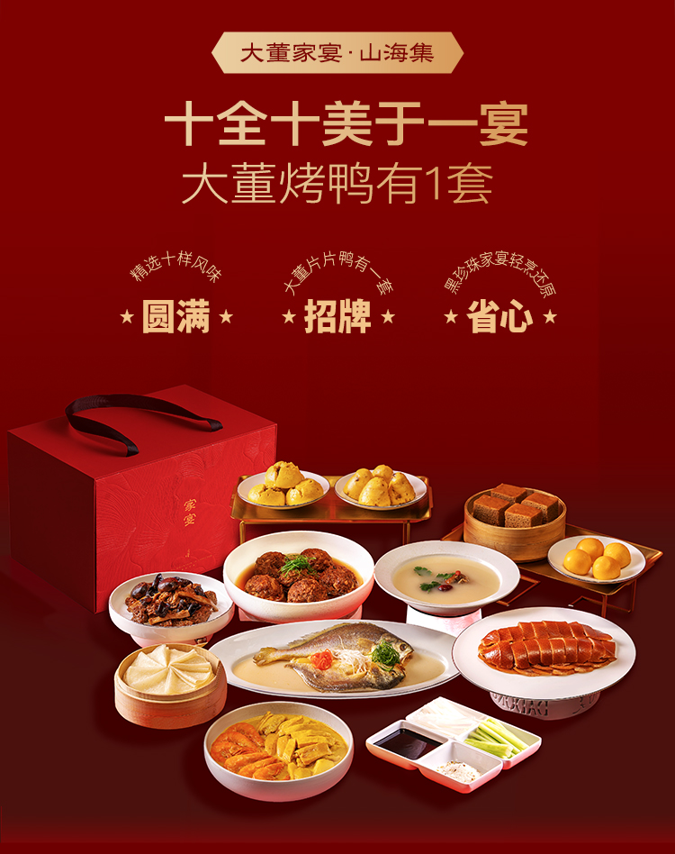 大董家宴・山海集总净含量 4.014kg,涵盖多样美味:含大董烤鸭(片片鸭 800g、鸭汤 329g)、鲜虾咖喱鸡、黄鱼鲞等热菜,搭配四喜烤麸,还有黄馍馍、枣栗子发糕等多款特色香饽饽,食材丰富,风味醇厚。