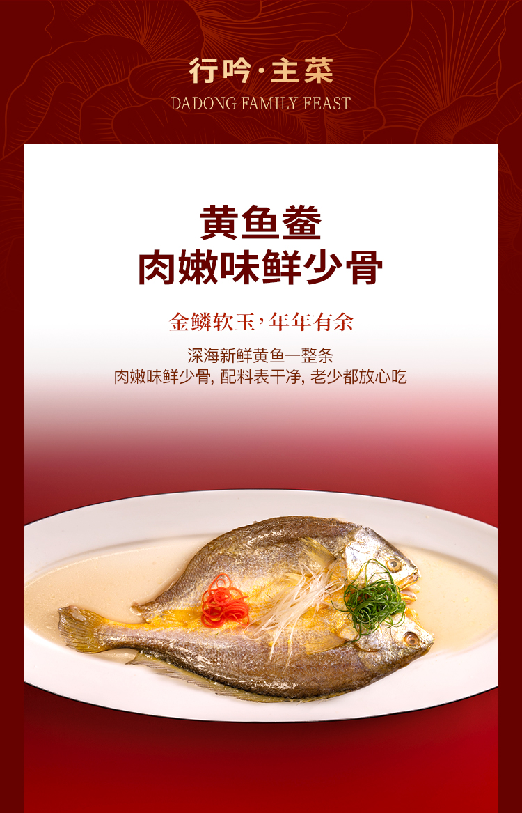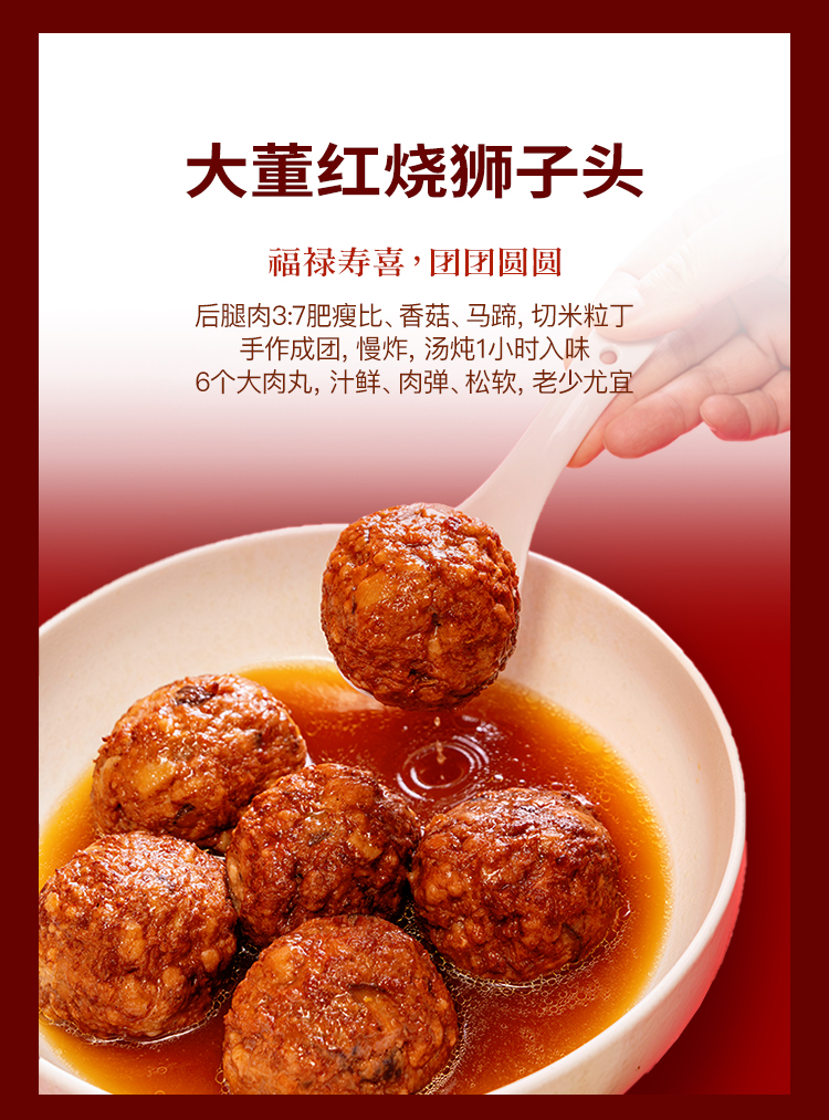 大董家宴・鲍鱼宴总净含量 6.7kg,主打高端鲜味:含一品鲍鱼煲、鲍鱼花胶鸭等鲍鱼核心菜品,搭配蜂蜜炖牛尾、鲜虾咖喱鸡、烤鸭及元气鸭汤,辅以黄鱼鲞、红烧狮子头,搭配双份年糕鱼、四喜烤麸,还有多款特色香饽饽,食材高端,品类丰富。