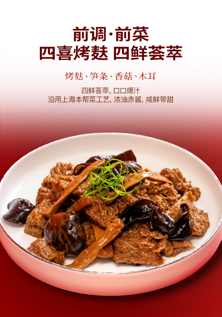 鲍汁(水、鸡肉、鸡架、鸡脚、猪骨、猪皮、鲍鱼、火腿、干贝、蚝油(含小麦粉、焦糖色)、马铃薯淀粉、食用盐)、猪手、鲍鱼、凤爪、花菇