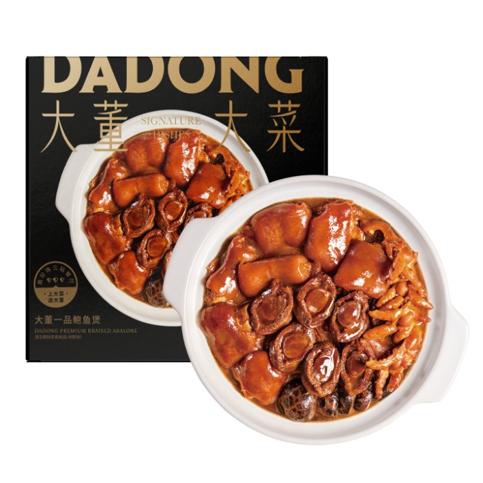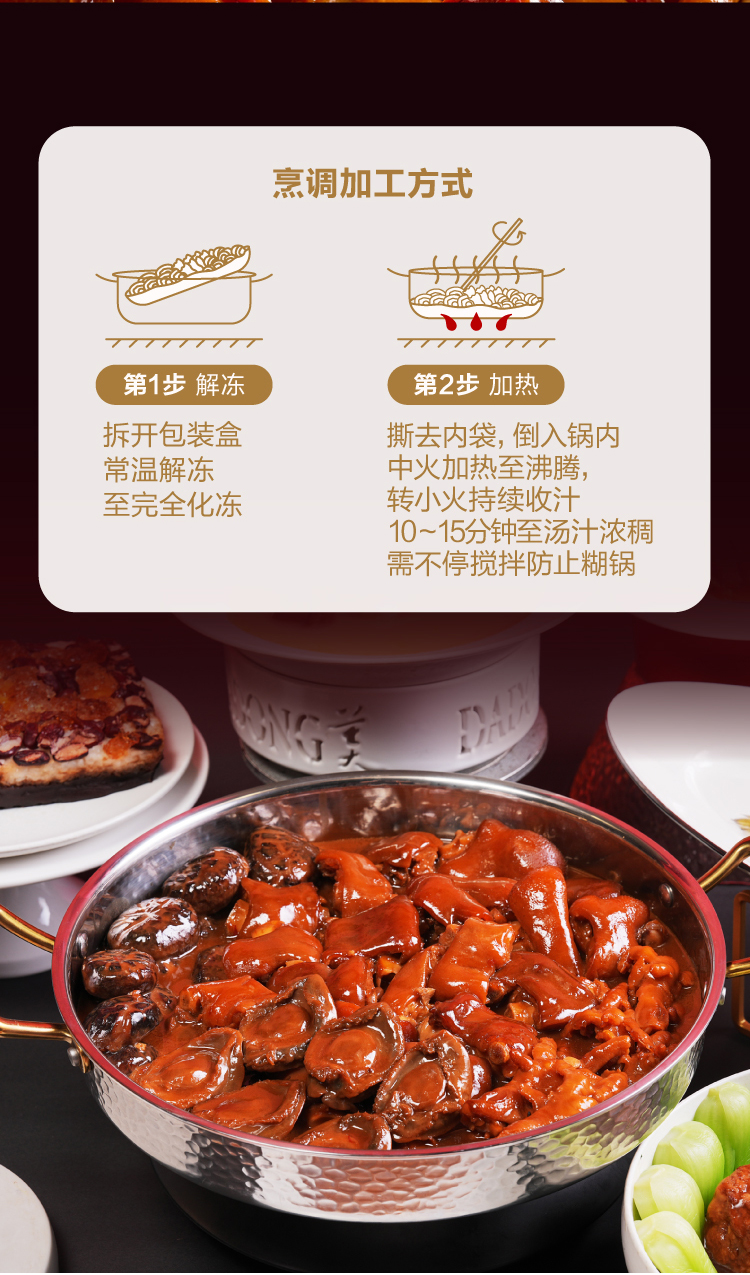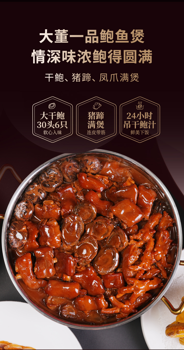 大董家宴・鲍鱼宴总净含量 6.7kg,主打高端鲜味:含一品鲍鱼煲、鲍鱼花胶鸭等鲍鱼核心菜品,搭配蜂蜜炖牛尾、鲜虾咖喱鸡、烤鸭及元气鸭汤,辅以黄鱼鲞、红烧狮子头,搭配双份年糕鱼、四喜烤麸,还有多款特色香饽饽,食材高端,品类丰富。