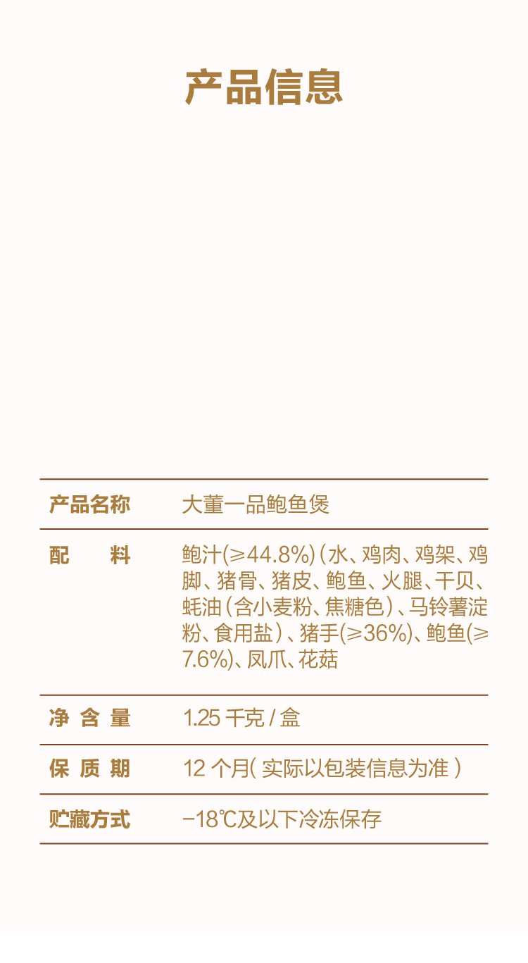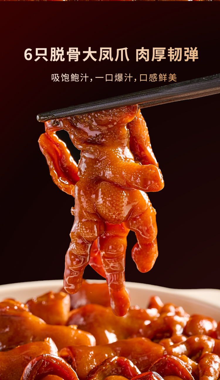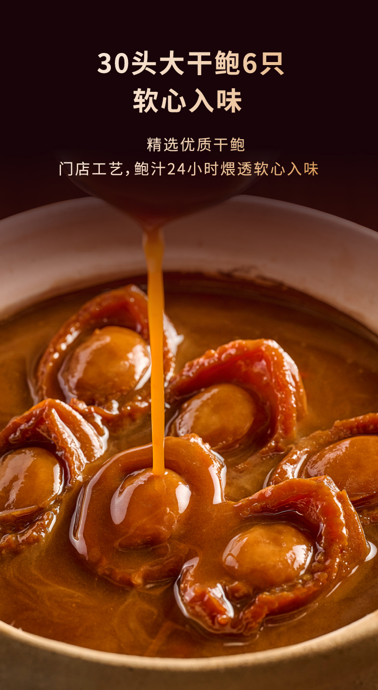 鲍汁(水、鸡肉、鸡架、鸡脚、猪骨、猪皮、鲍鱼、火腿、干贝、蚝油(含小麦粉、焦糖色)、马铃薯淀粉、食用盐)、猪手、鲍鱼、凤爪、花菇
