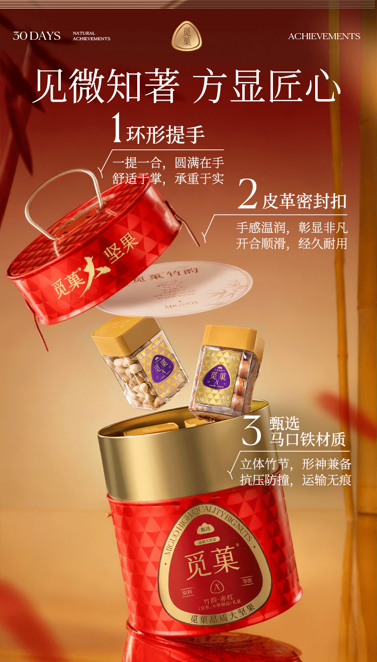 觅菓坚果配置丰富,选材严谨、礼盒设计符合现代社会审美,适合企业员工福利发放、答谢客户、商务礼赠等场景,企业团购优惠多多,欢迎选购。