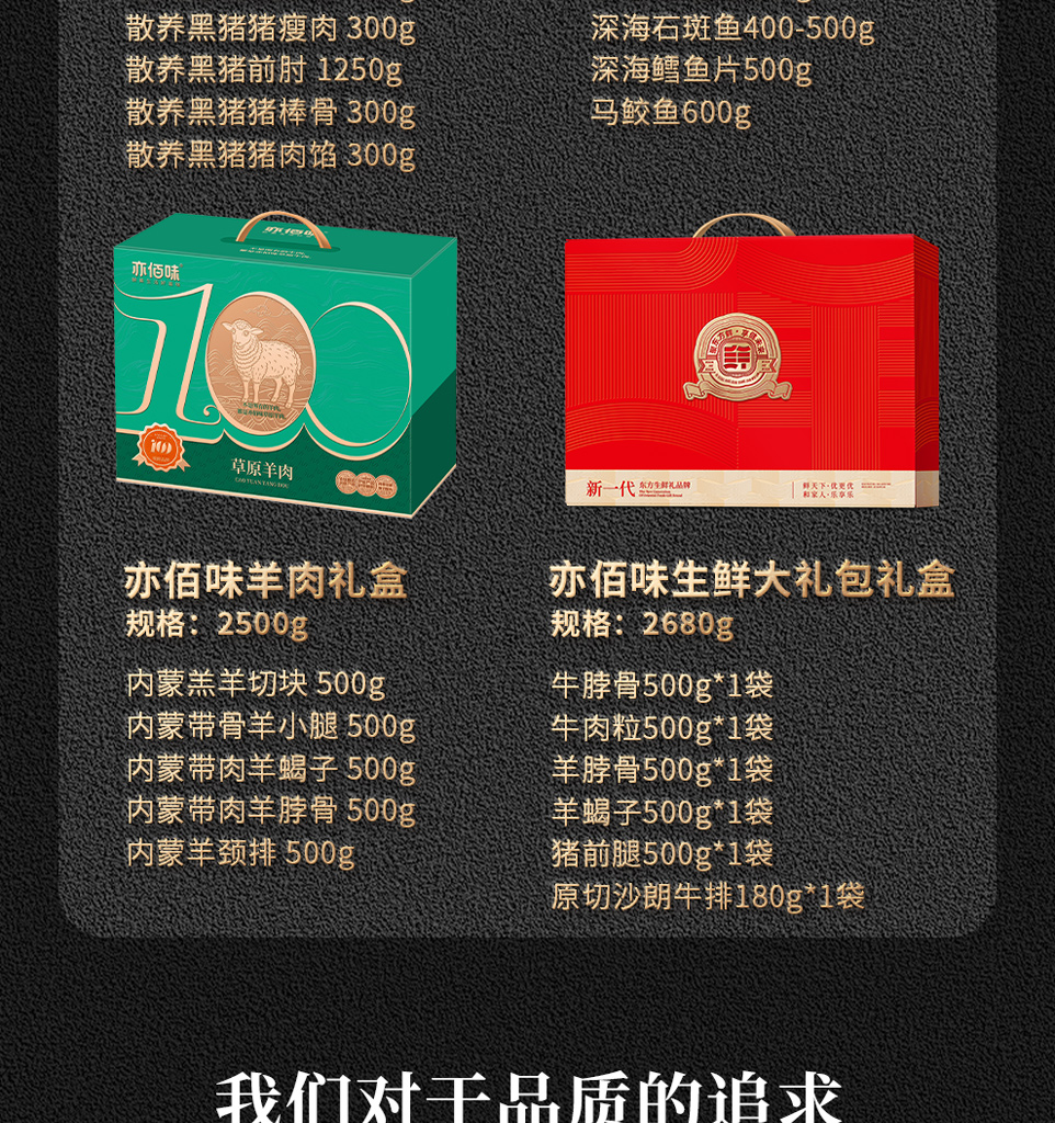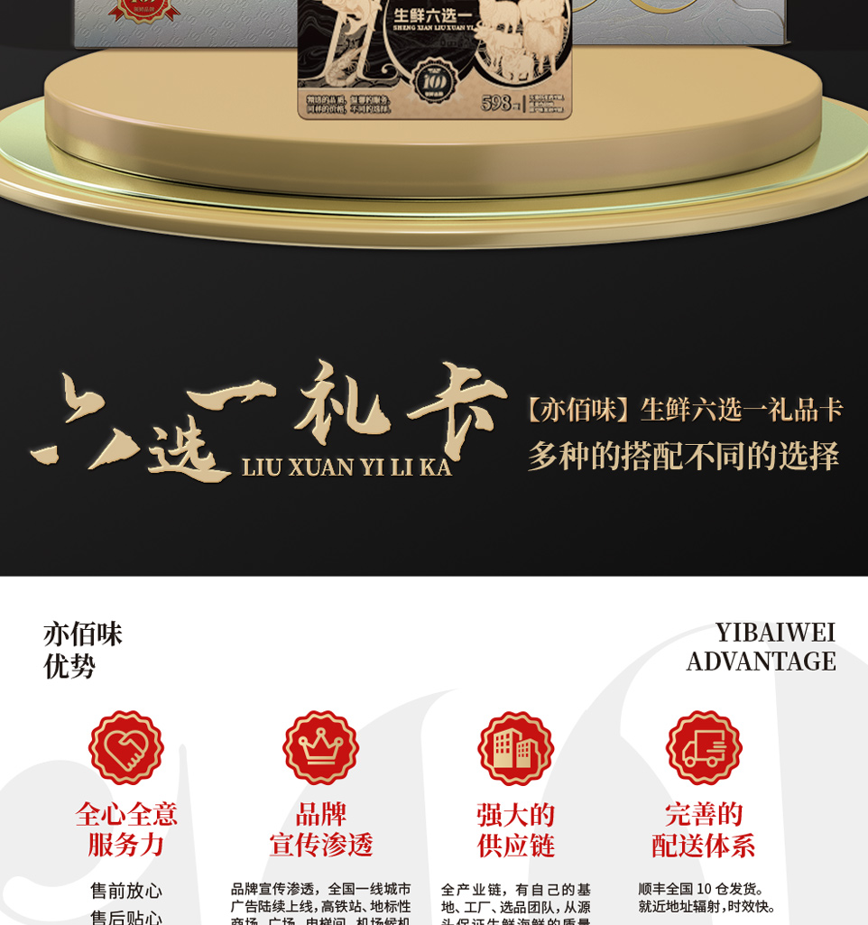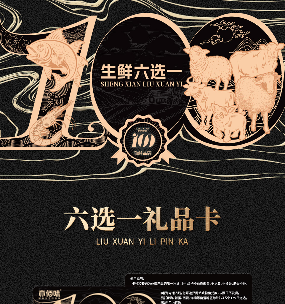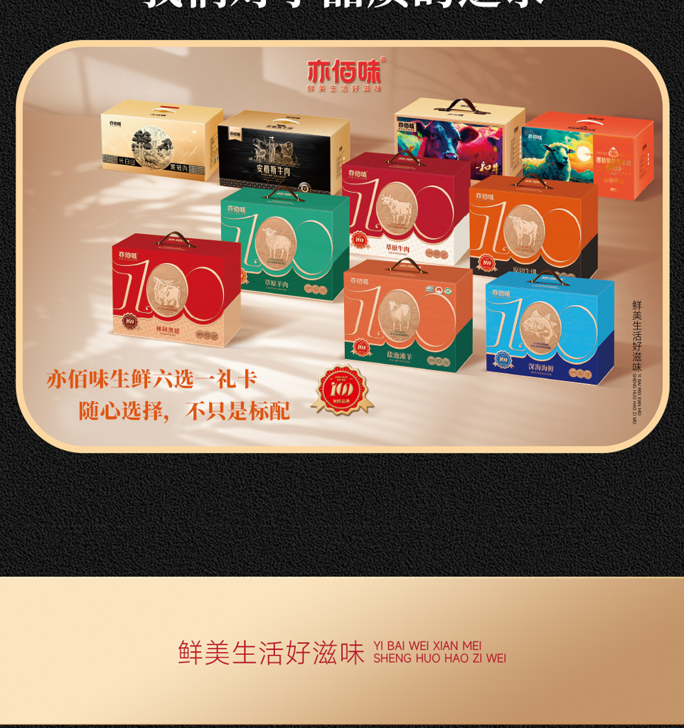 亦佰味生鲜六选一礼品卡配备六个套餐,各个品类应有尽有,收礼人可根据自身需求及喜好,自选符合心意的礼品套餐,从而满足了众口难调的需求,让生鲜礼品更有心意。