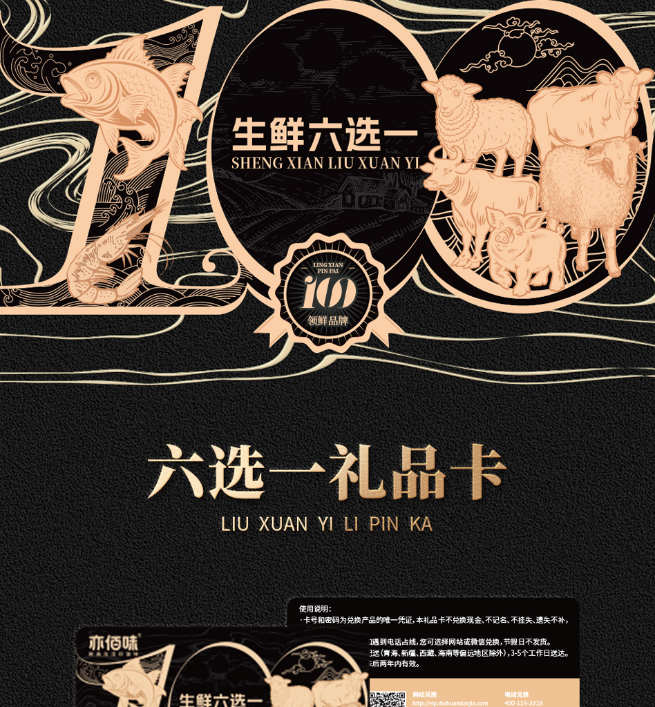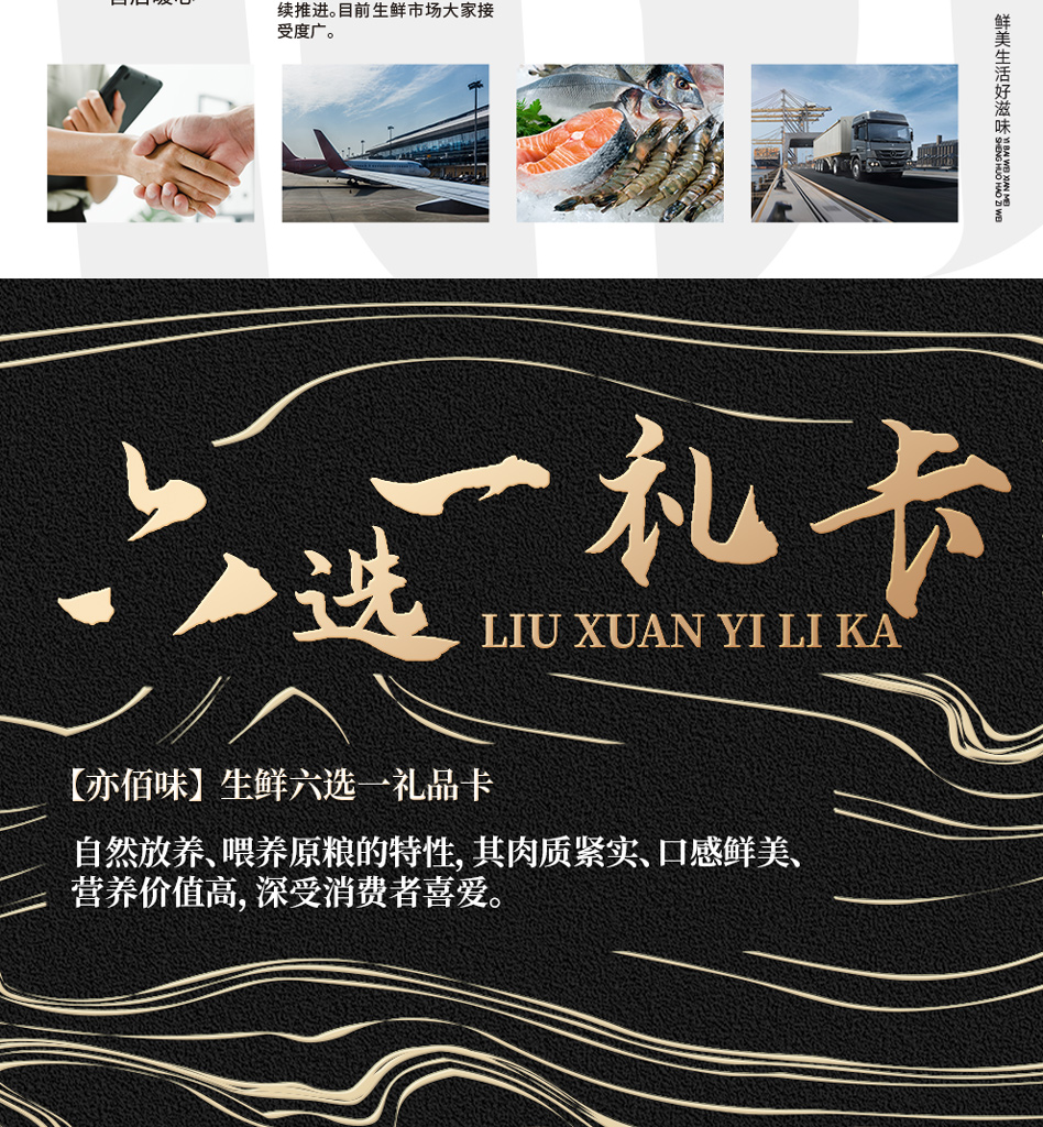 亦佰味生鲜六选一礼品卡配备六个套餐,各个品类应有尽有,收礼人可根据自身需求及喜好,自选符合心意的礼品套餐,从而满足了众口难调的需求,让生鲜礼品更有心意。
