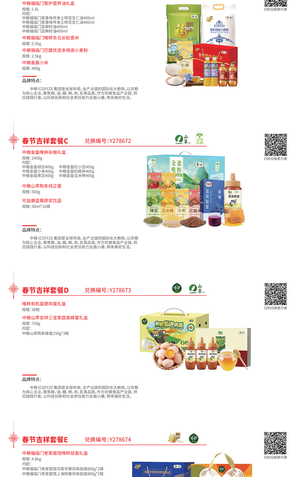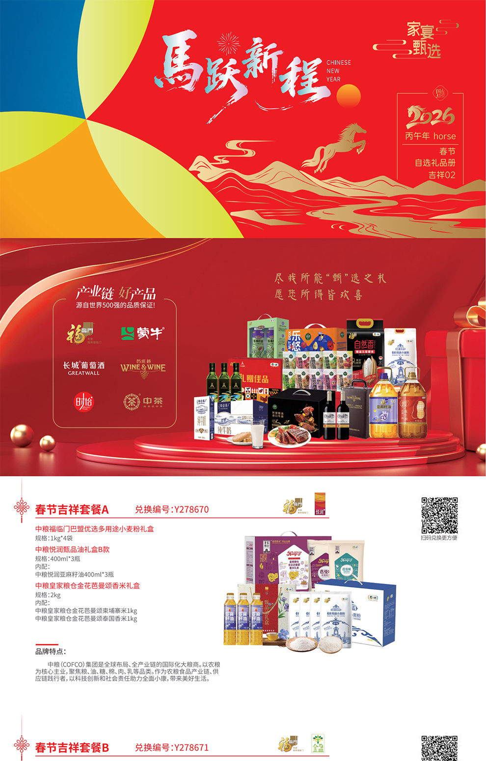 2026春节·家宴甄选20选1自选礼品册,甄选10款中粮食品+10款商务品,为过年员工福利发放及送礼客户提供选礼、送礼解决方案。持册人可通过自选礼品册任意选择1款喜爱的套餐兑换,全国免费配送到家,应用于礼尚往来、客户答谢、商务馈赠等场景!