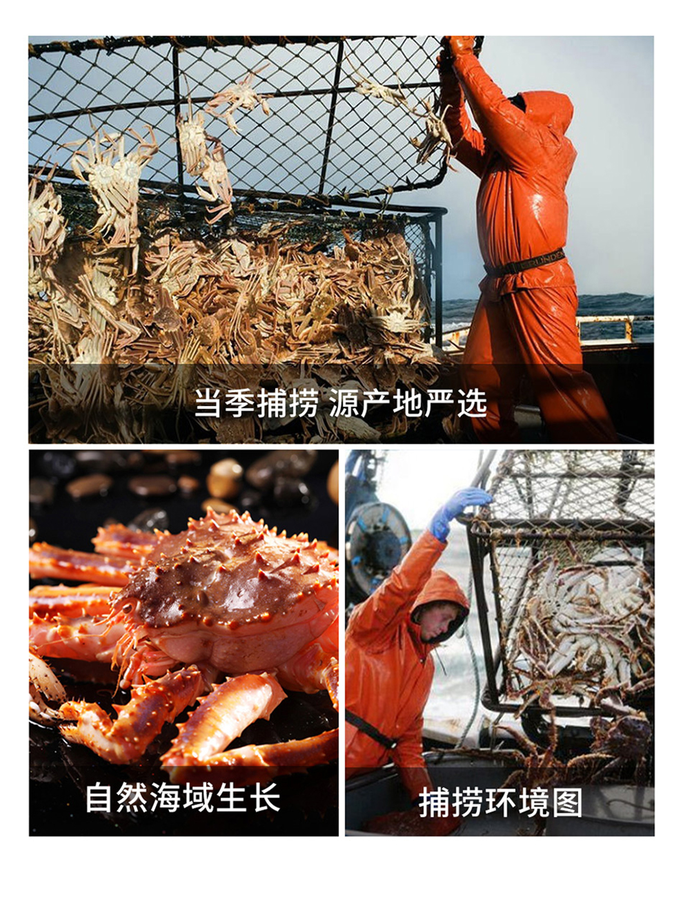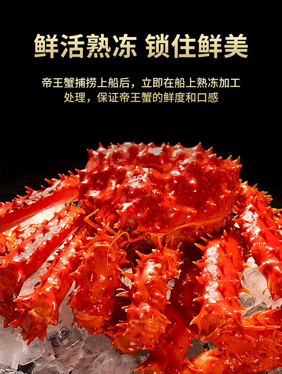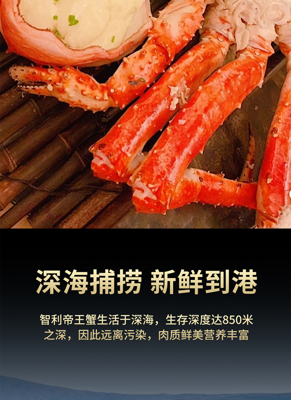 智利帝王蟹生活于深海,生存深度达850米之深,因此远离污染,肉质鲜美营养丰富,帝王蟹捕捞上传后,立即在船上熟冻加工处理,保证帝王蟹的鲜度和口感。
