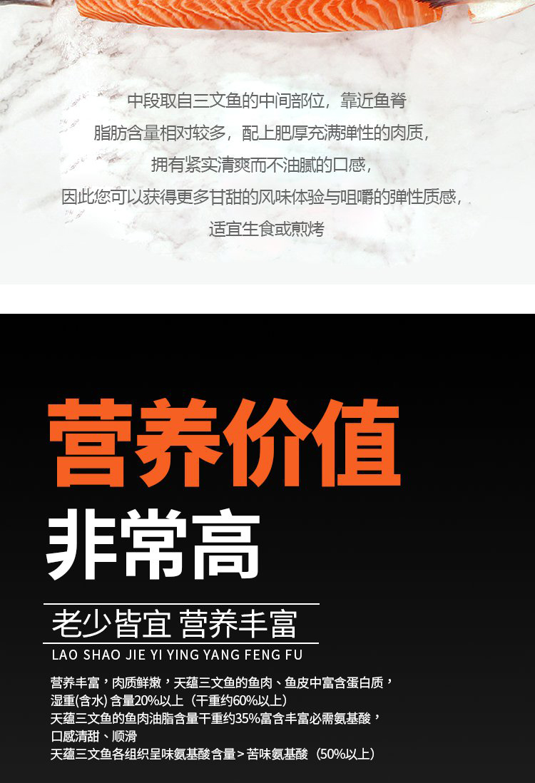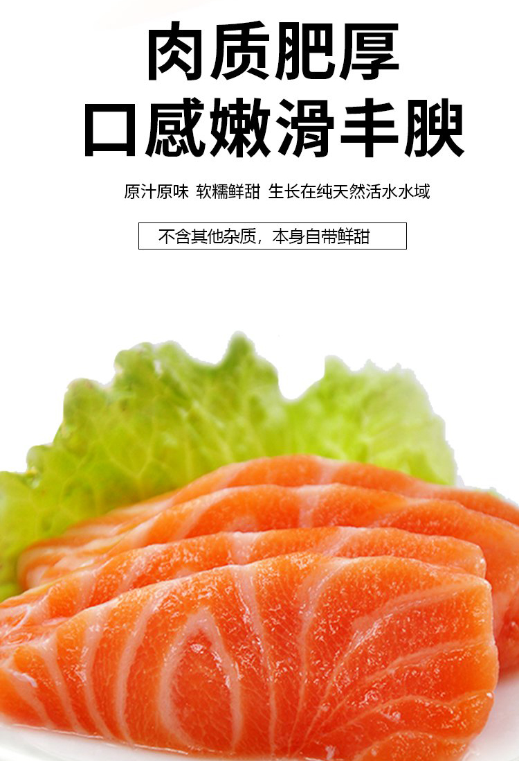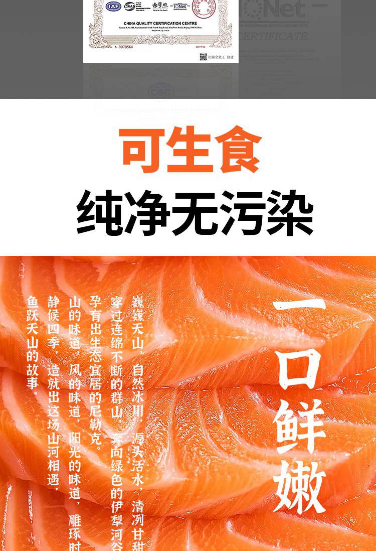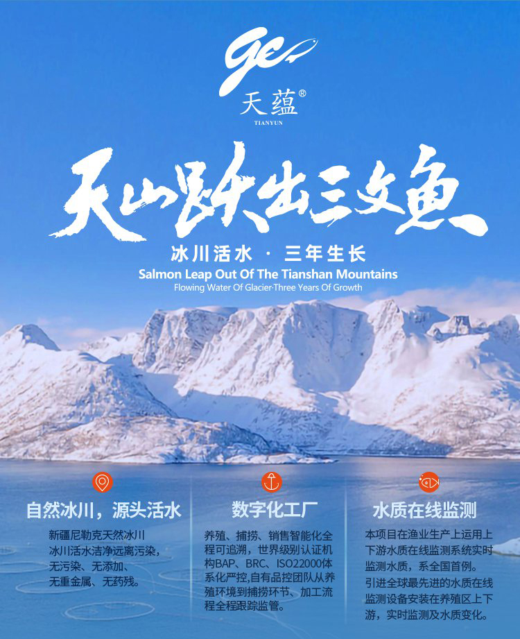 天蕴三文鱼来自美丽的新疆,在新疆尼勒克天然冰川,无污染、无添加、无重金属、无药残,天然冰川活水,三年冷水慢养,肉质肥厚,口感嫩滑鲜甜,营养价值非常高。