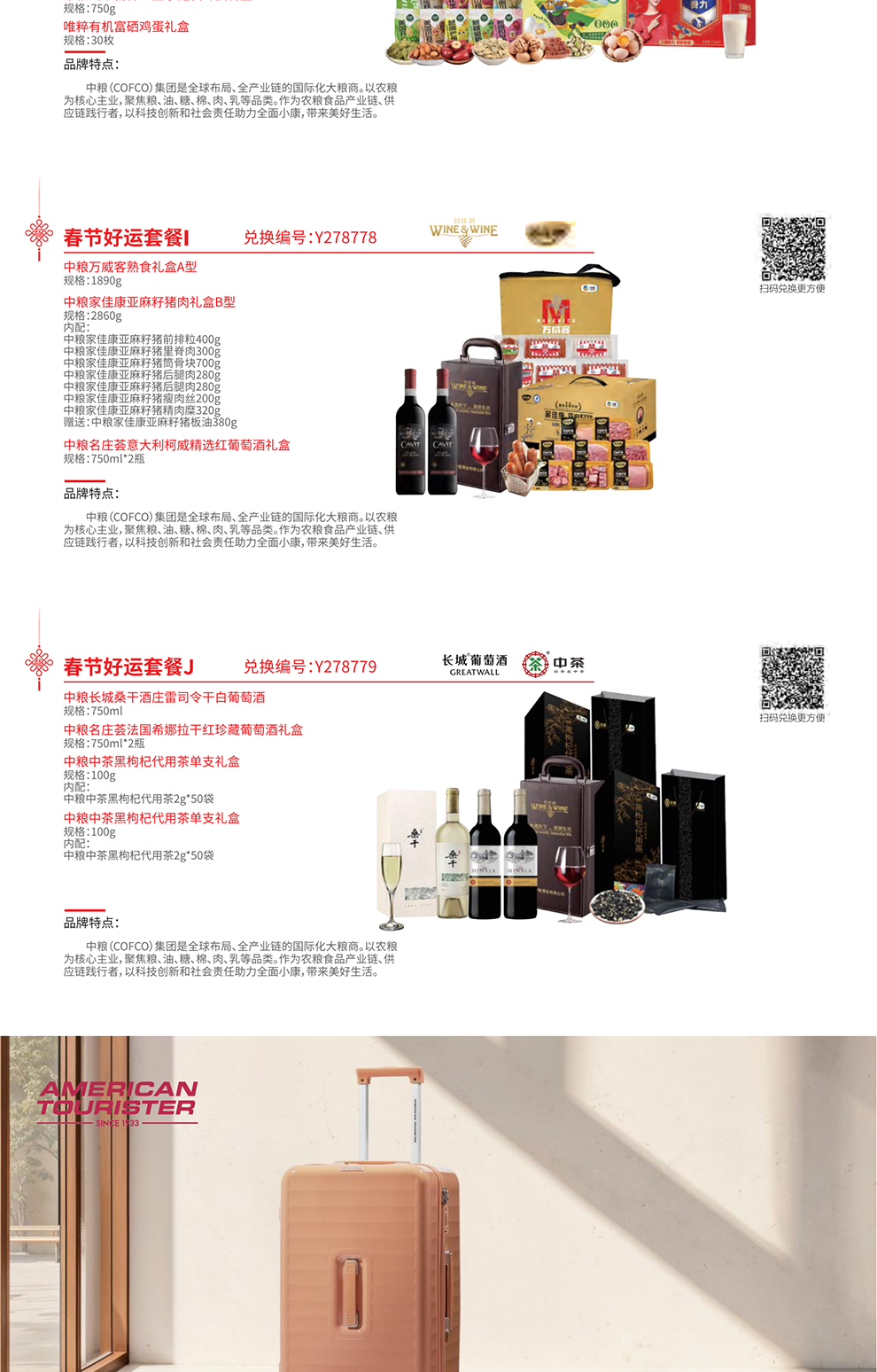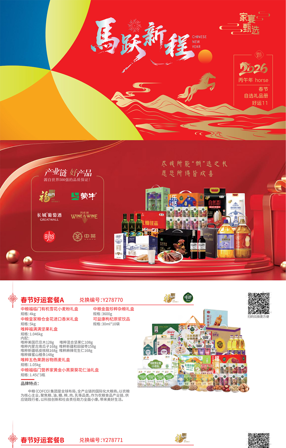 2026春节·家宴甄选20选1自选礼品册,甄选10款中粮食品+10款商务品,为过年福利发放及送礼客户提供选礼、送礼解决方案。持册人可通过自选礼品册任意选择1款喜爱的套餐兑换,全国免费配送到家,应用于礼尚往来、客户答谢、商务馈赠等场景!