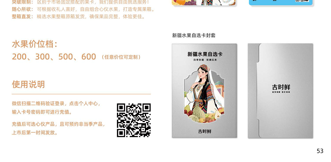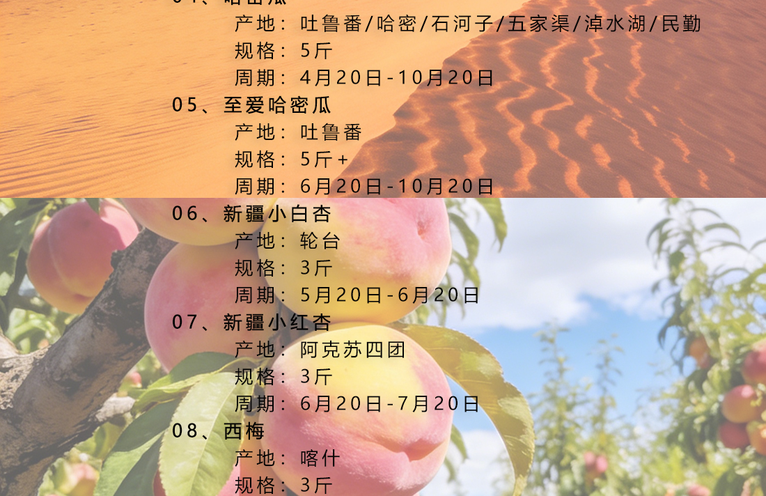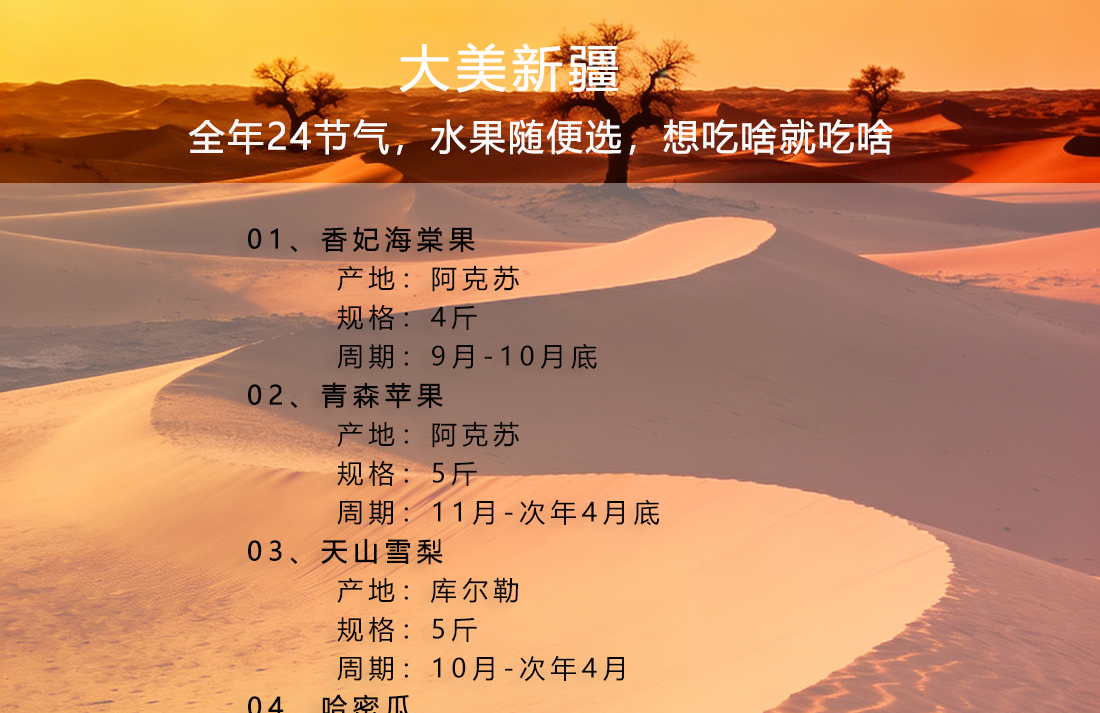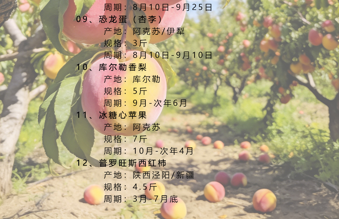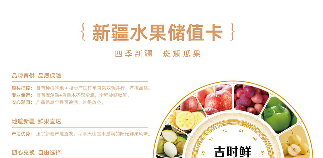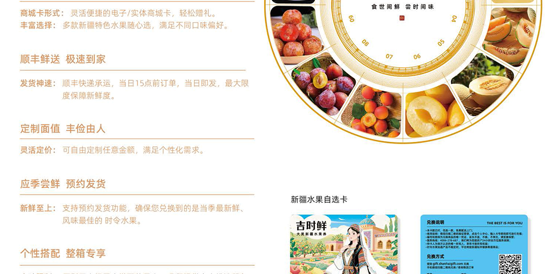 新疆水果自选卡,依托新疆专业水果供应链,自由种植基地+核心产区农户订单直采”双轨并行模式,新疆产地直发,当天3点之前订单,顺丰当天发出,持卡人可通过商城在多种水果中随意选择喜爱的水果兑换,也可预约发货,确保兑换到当季最新鲜、风味最佳的时令水果。和市场上固定特配组合的水果卡不同,这款大美新疆水果卡,是根据用户喜好,自己挑选喜爱的水果整箱发货,让水果礼赠更有心意。
