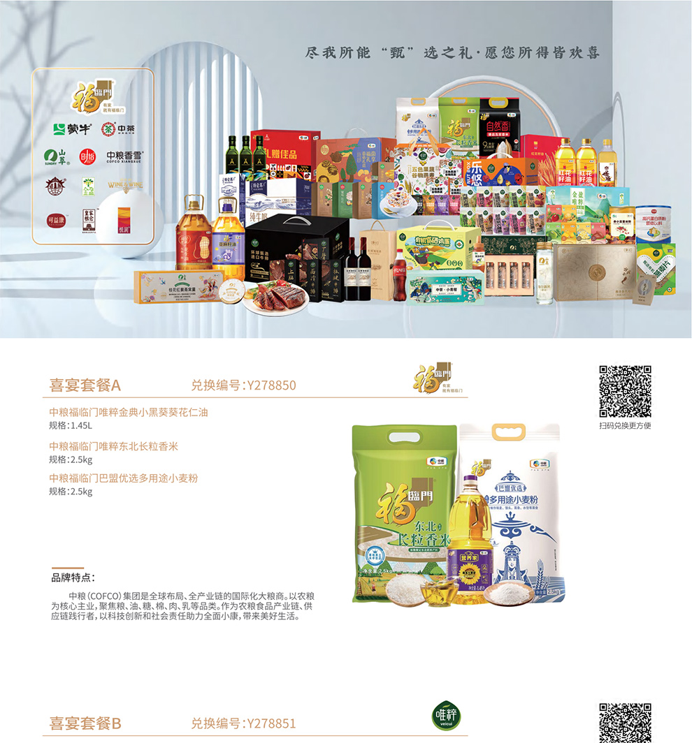 2026家宴甄选通用自选礼品册,是为日常选礼及送礼用户提供礼品解决方案,礼品册在内容搭配上甄选中粮集团旗下10款食品和一线品牌商务品,内容丰富多样,可满足不同收礼人需求,主要用于日常送礼、客户答谢、商务馈赠、慰问员工、送领导等场景,让您选礼更轻松、收礼更满意。