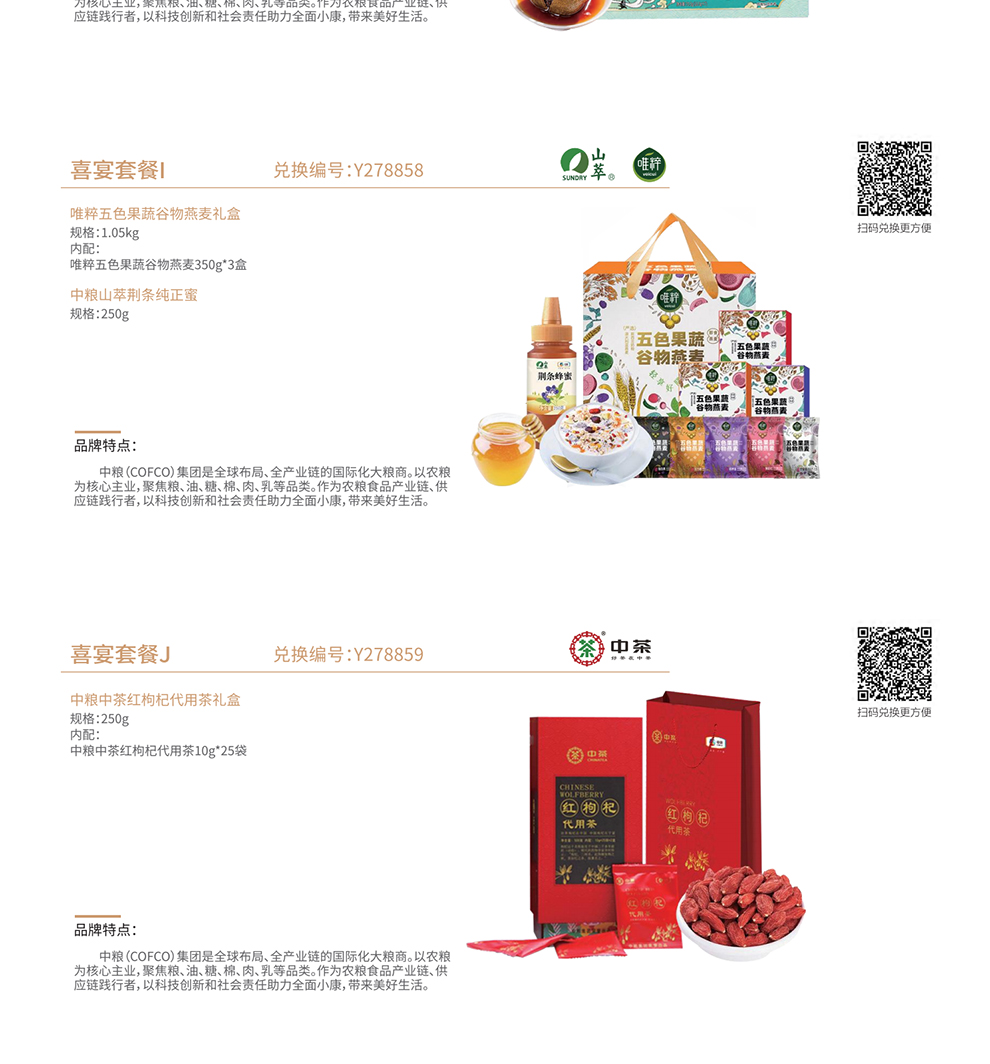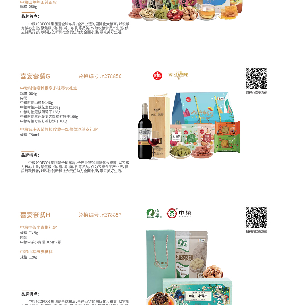 | 礼册优势: | 家宴甄选通用版自选礼品册不包含节日及时令性产品,20款产品全年均可提货,在产品配置上搭配了10款中粮集团旗下食品套餐,食品安全更放心,另外还有10款家用商务品可选,持册人可以从礼品册20个方案中任意选择一款喜爱的套餐提货,全国免费配送上门,省去了您选品、采购、发货的时间成本,也让送出去的礼物更贴心意。 |