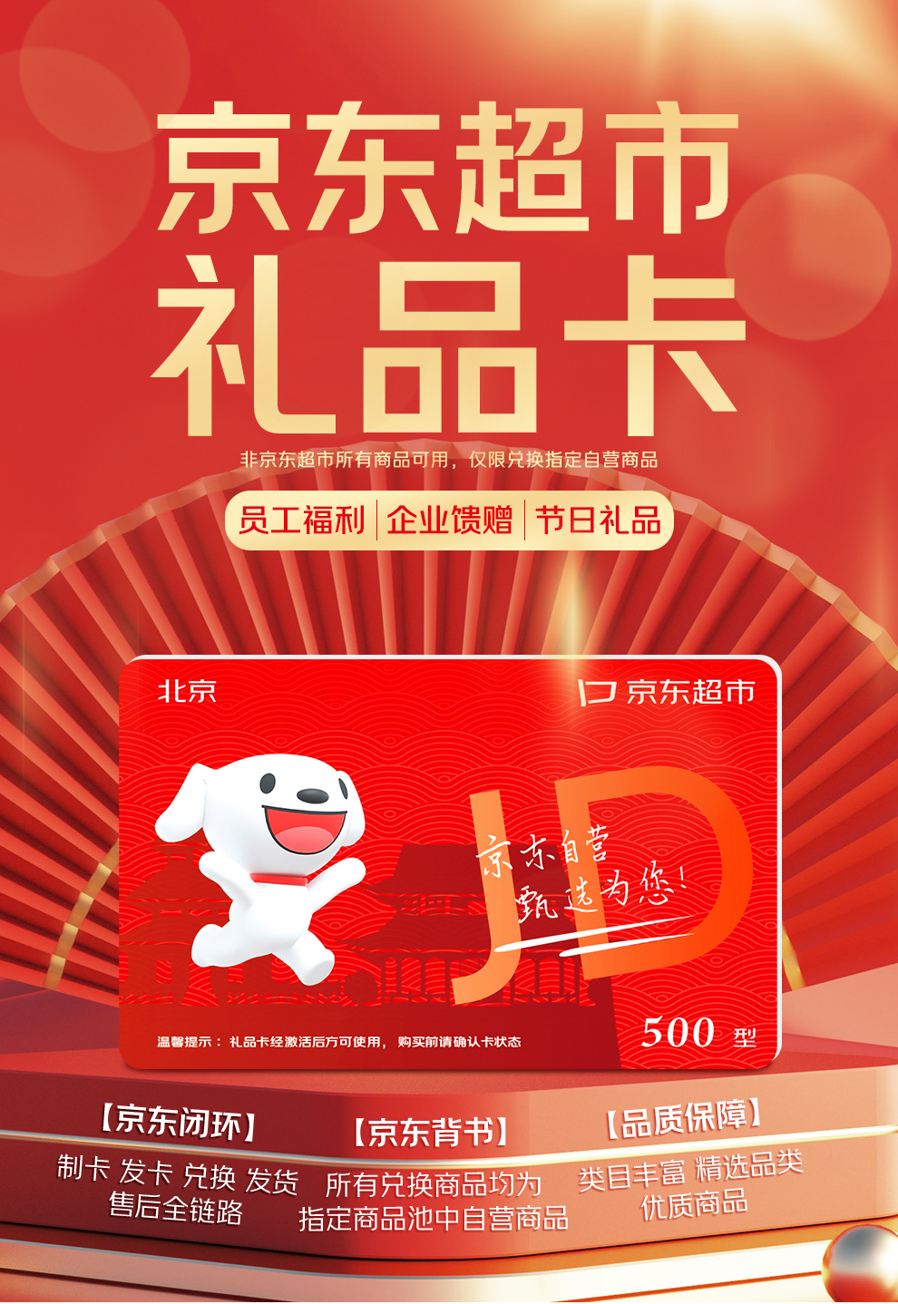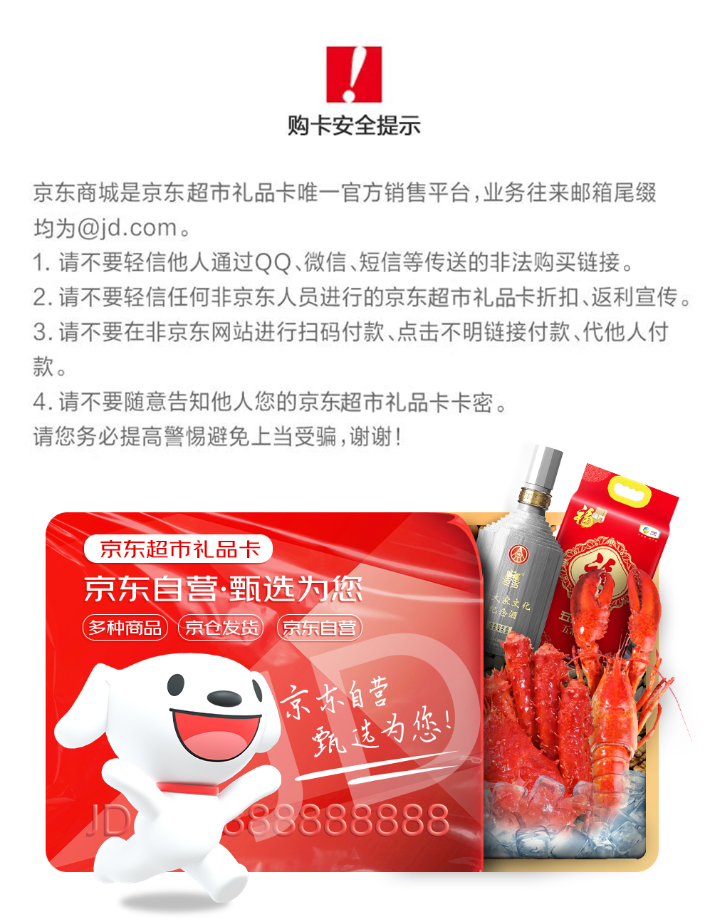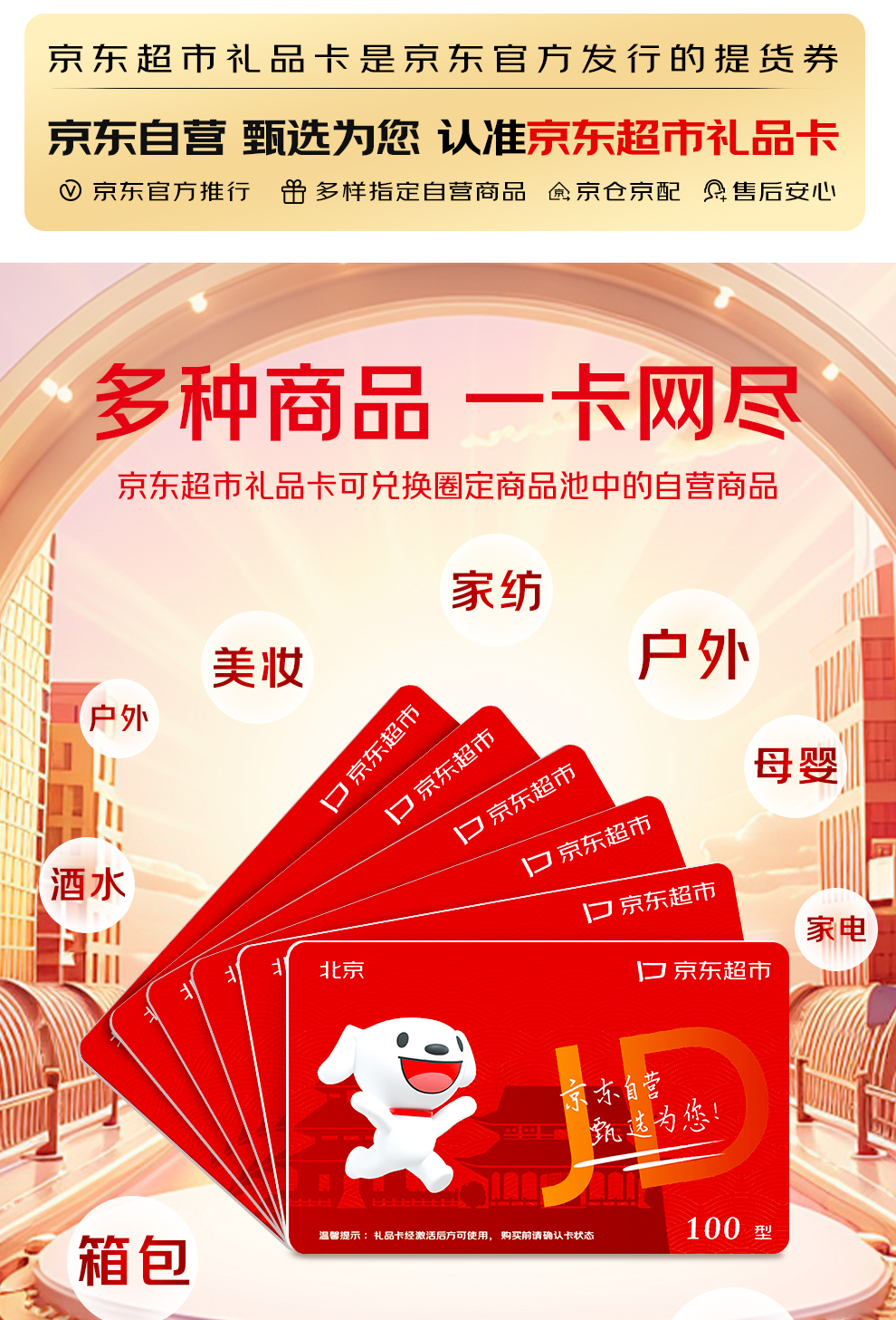 京东超市礼品卡是目前唯一一家集制卡、发卡、兑换、发货、售后全链路京东闭环的礼品卡,持卡人可通过京东APP平台兑换商品,京东物流履约发货;本款京东卡礼品池丰富多彩,所有兑换商品均为京东自营商品,商品品质有保障。