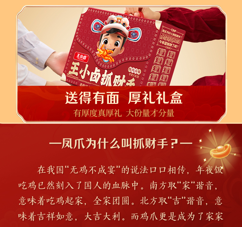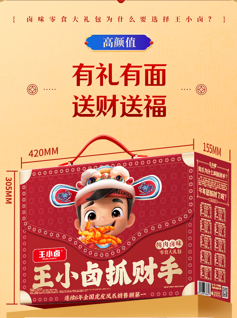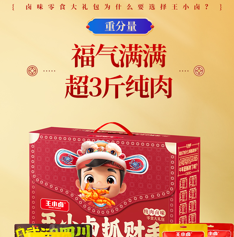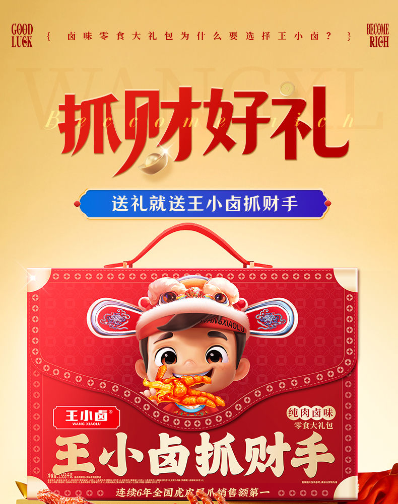 王小卤(网红爆款产品)好吃到让你嗦手指,专业服务90/00后的消费采购新势力,王小卤抓财手大礼包为企业福利专属定制,产品丰富、口味种类全,非常适合节日员工福利发放、年轻一代商务馈赠使用,支持全国一件代发、企业集采,欢迎团购咨询。
