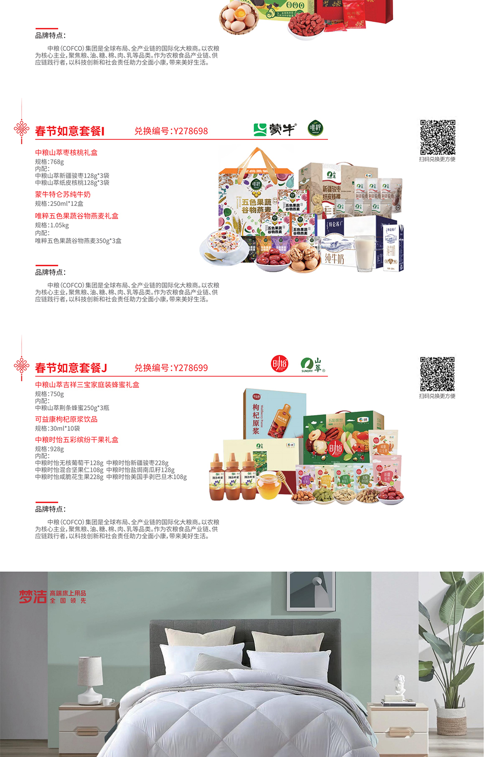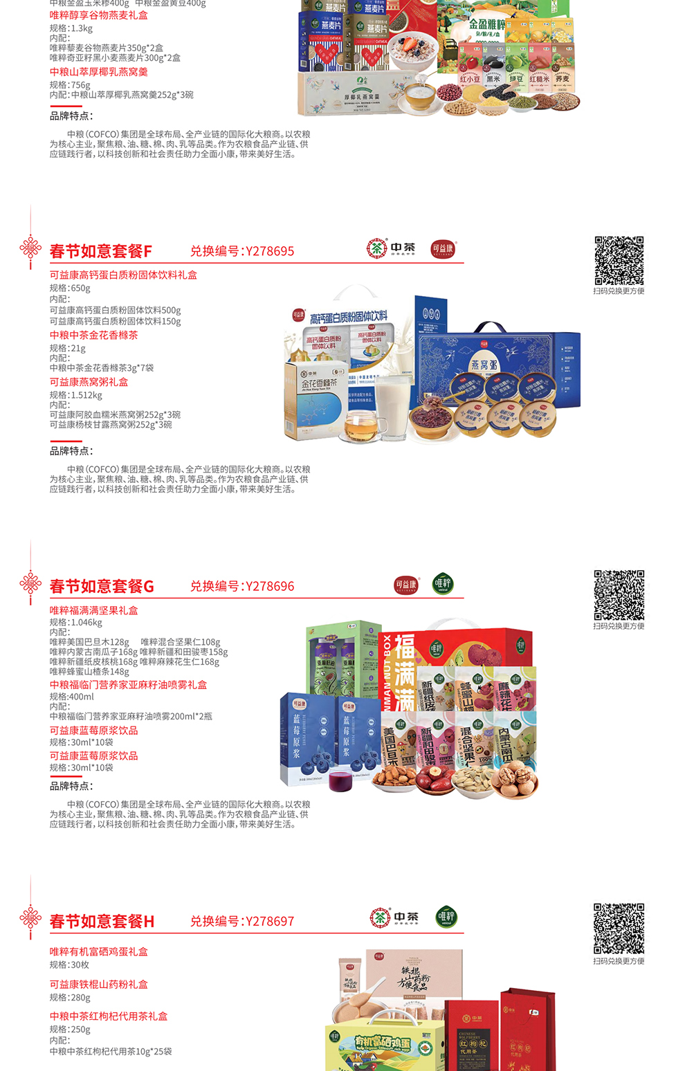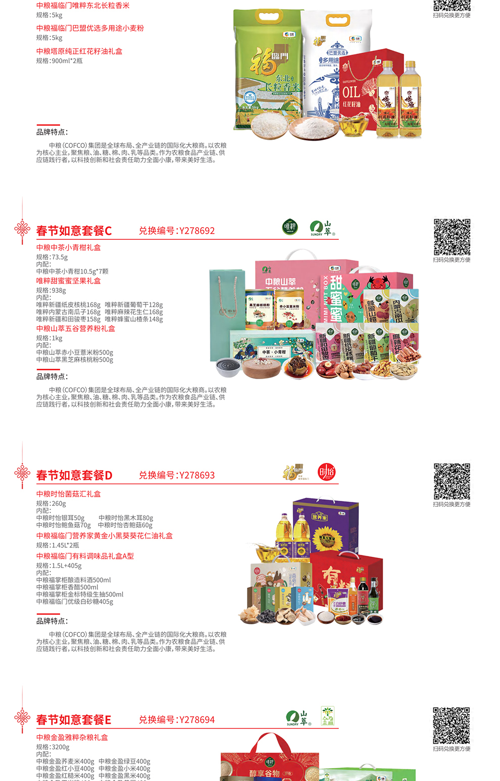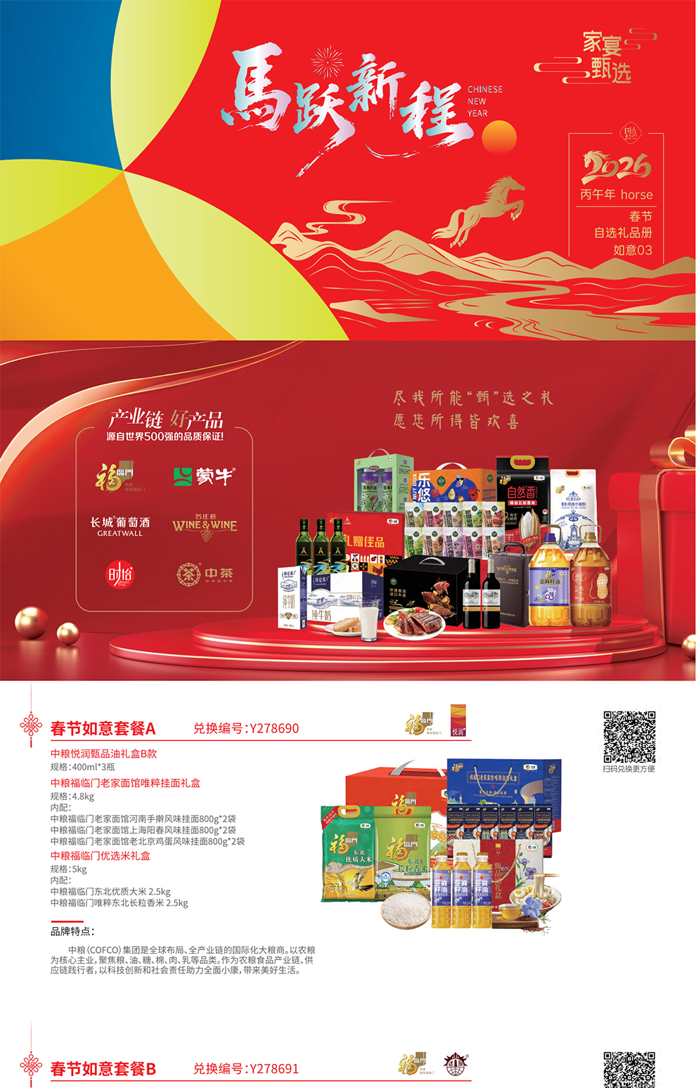 2026春节·家宴甄选20选1自选礼品册,甄选10款中粮食品+10款商务品,为过年节员工福利发放及送礼客户提供选礼、送礼解决方案。持册人可通过自选礼品册任意选择1款喜爱的套餐兑换,全国免费配送到家,应用于礼尚往来、客户答谢、商务馈赠等场景!