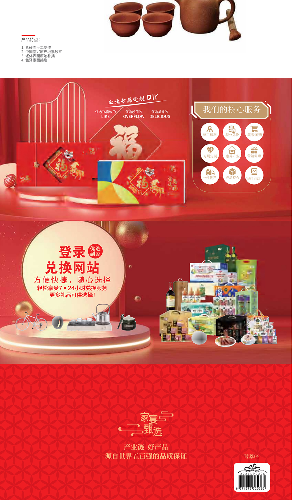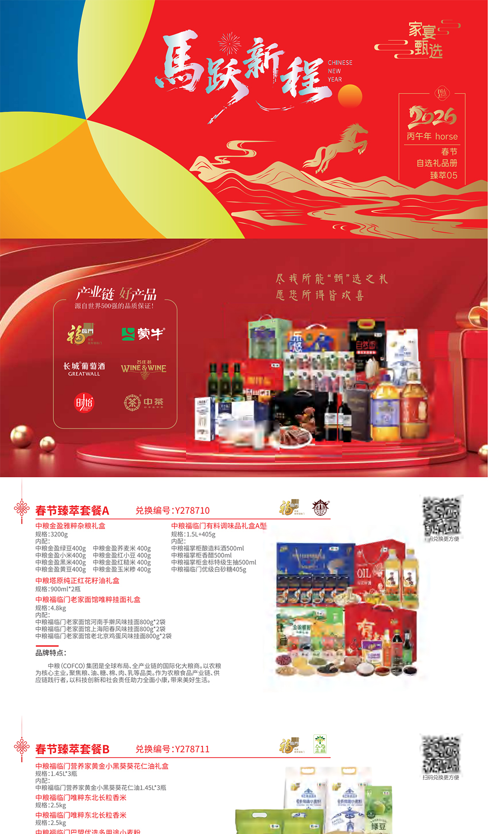 2026春节·家宴甄选20选1自选礼品册,甄选10款中粮食品+10款商务品,为过年员工福利发放及送礼客户提供选礼、送礼解决方案。持册人可通过自选礼品册任意选择1款喜爱的套餐兑换,全国免费配送到家,应用于礼尚往来、客户答谢、商务馈赠等场景!