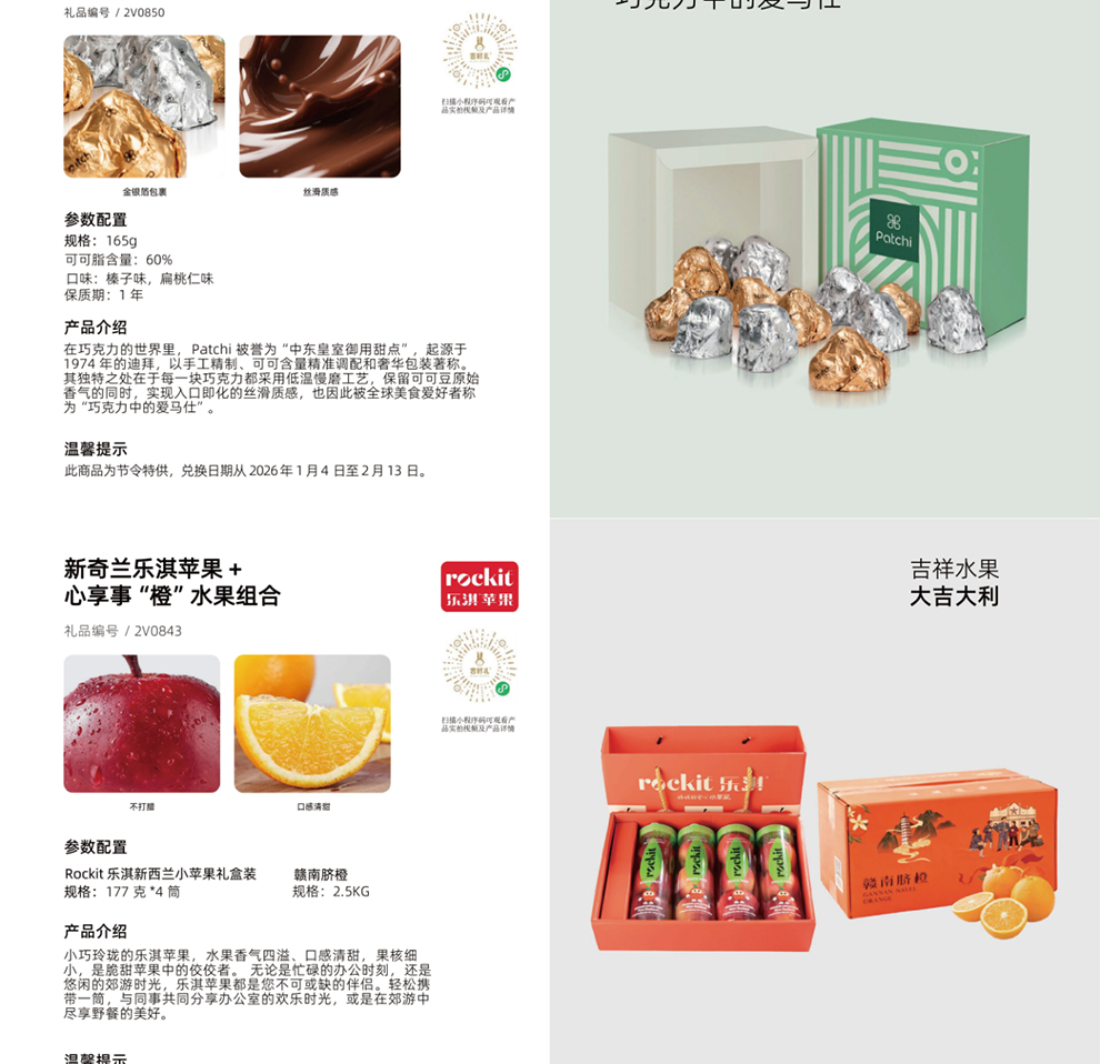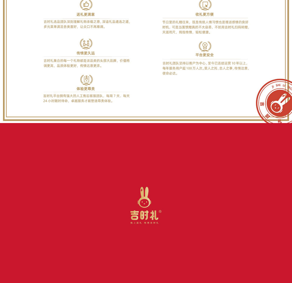 | 产品属性: | 吉时礼是为中高端用户提供的礼赠解决方案,满足不同受众人群,让送礼更便捷、收礼更满意 |